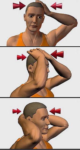Ambas manos colocadas en la zona superior de la cabeza hacen fuerza hacia atrás mientras que con la cabeza se hace fuerza hacia delante. Mantener 10 segundos y realizar 3 veces.
